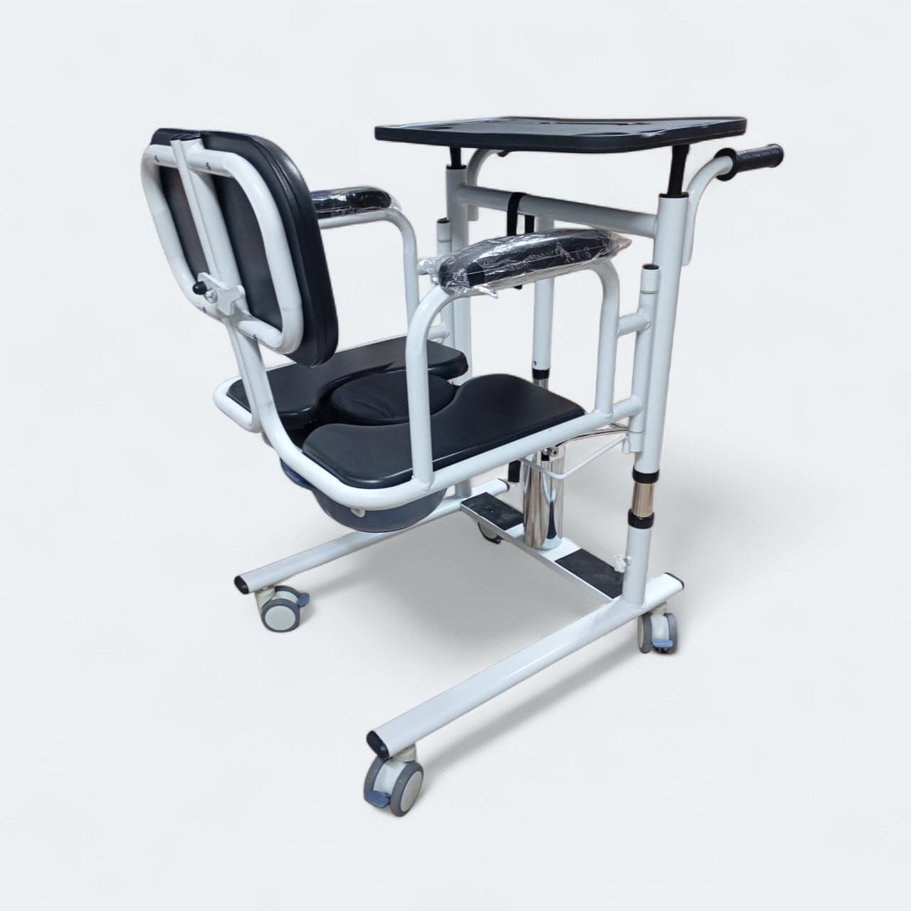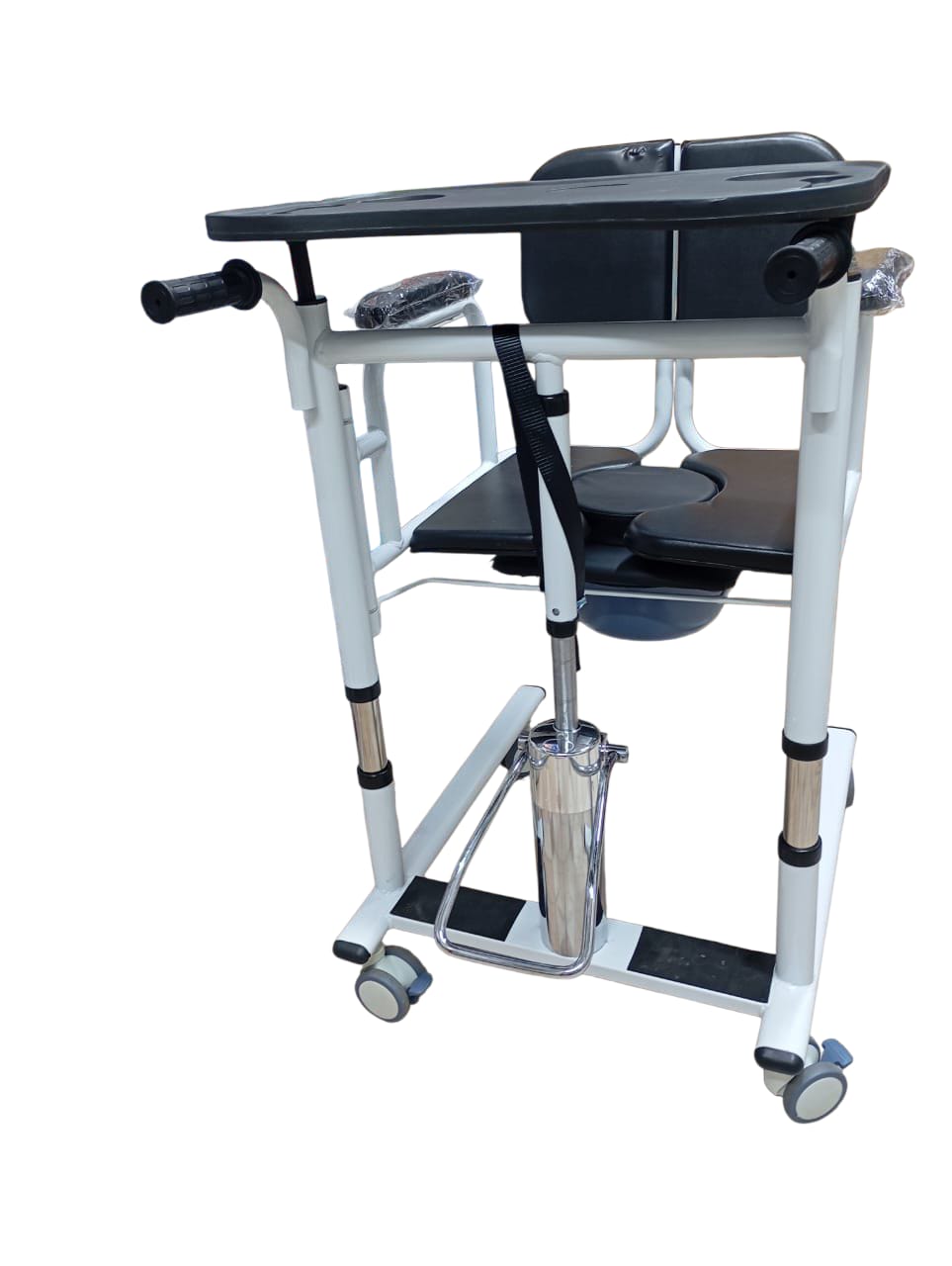 patient lift transfer chair, also known as a patient transfer wheelchair. It is a multi-functional device designed to assist in the transfer of individuals with mobility limitations, such as the elderly or disabled. Features Adjustable Design: The chair often has adjustable height and sometimes width to accommodate different users and transfer scenarios. Multi-functional: It can serve as a patient lift, transport wheelchair, bedside commode chair, and shower chair. Safety Mechanisms: Features include quiet front and rear casters with locking mechanisms, 360-degree movable rollers, and secure buckles or restraints to prevent falls. Durable and Portable: The chair is typically made from durable materials like alloy steel and is designed to be lightweight for easy handling and transport. Split Seat: The seat is often split to allow for easy placement and removal without having to lift the user completely. Uses Patient Transfers: The primary use is to safely and efficiently move individuals between a bed, wheelchair, toilet, shower, or car. Home Care and Medical Facilities: It is ideal for daily use in home care settings, hospitals, and nursing homes. Assisting Daily Living Activities: The chair facilitates activities such as bathing and toileting, promoting independence for the user. Benefits Reduces Strain: The design minimizes the physical strain on both the caregiver and the patient during transfers. Promotes Independence: It allows users to participate in daily activities with greater ease and dignity. Versatility: The multi-functional nature of the chair reduces the need for multiple pieces of equipment. Enhanced Safety: Locking mechanisms and secure restraints help prevent accidents and injuries.