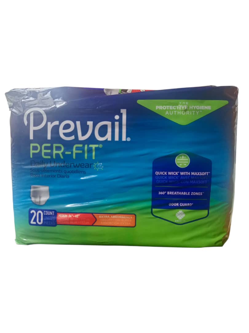 Prevail Per-Fit Daily Underwear, which is a type of disposable protective underwear for incontinence. Specifications: Size: Medium (M) Waist/Hip Size: 34 to 46 inches Count: 20 per package Absorbency: Extra Absorbency or Heavy Absorbency Manufacturer Part Number: PF-512 Gender: Unisex Features: QuickWick with MaxSoft Technology: Designed to rapidly pull liquid away from the skin and into the absorbent core. 360° Breathable Zones: Allows air to circulate around the garment to help keep the skin cool and dry. Odor Guard: Helps to minimize odors. Comfort-Shape Plus: Provides a secure and discreet fit. Easy-Lock Fastener Strips: Ensures a secure fit. Cloth-like backing: Provides a feel similar to traditional underwear.