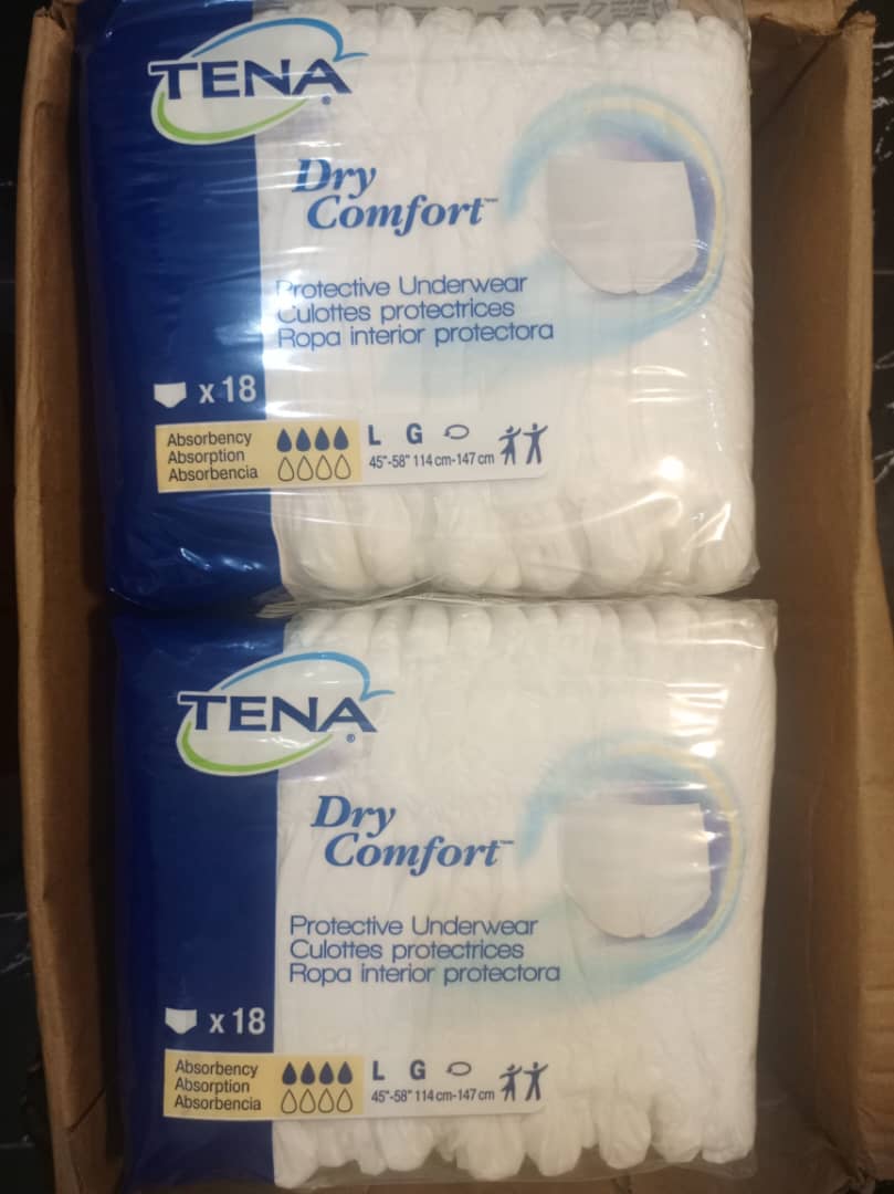 TENA Dry Comfort Protective Underwear, size Large, with 18 pieces per package.