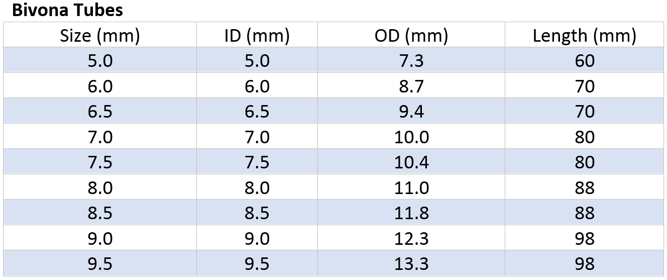 | Size | • Measured by Internal Diameter (ID) and External Diameter (OD) • Adult ID range: 6.0–10.0 mm • Pediatric ID range: 3.0–6.0 mm • OD typically: ~10 mm (female), ~11 mm (male) depending on anatomy |